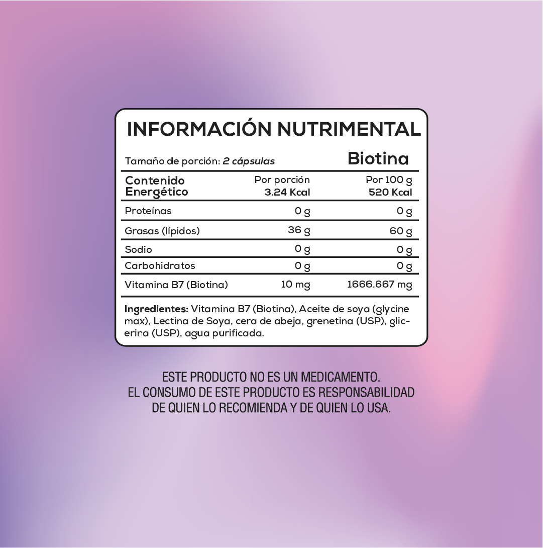 ¡Disfruta de los beneficios de la Biotina! Esta vitamina B estimula la producción de queratina para la salud del cabello, la piel y las uñas. Puede prevenir la caída del cabello y fortalecerlo, evitando que se vuelva débil y quebradizo. Además, promueve un crecimiento más acelerado del cabello y las uñas. ¡Descubre el poder de la Biotina y realza tu belleza natural con cada cápsula!