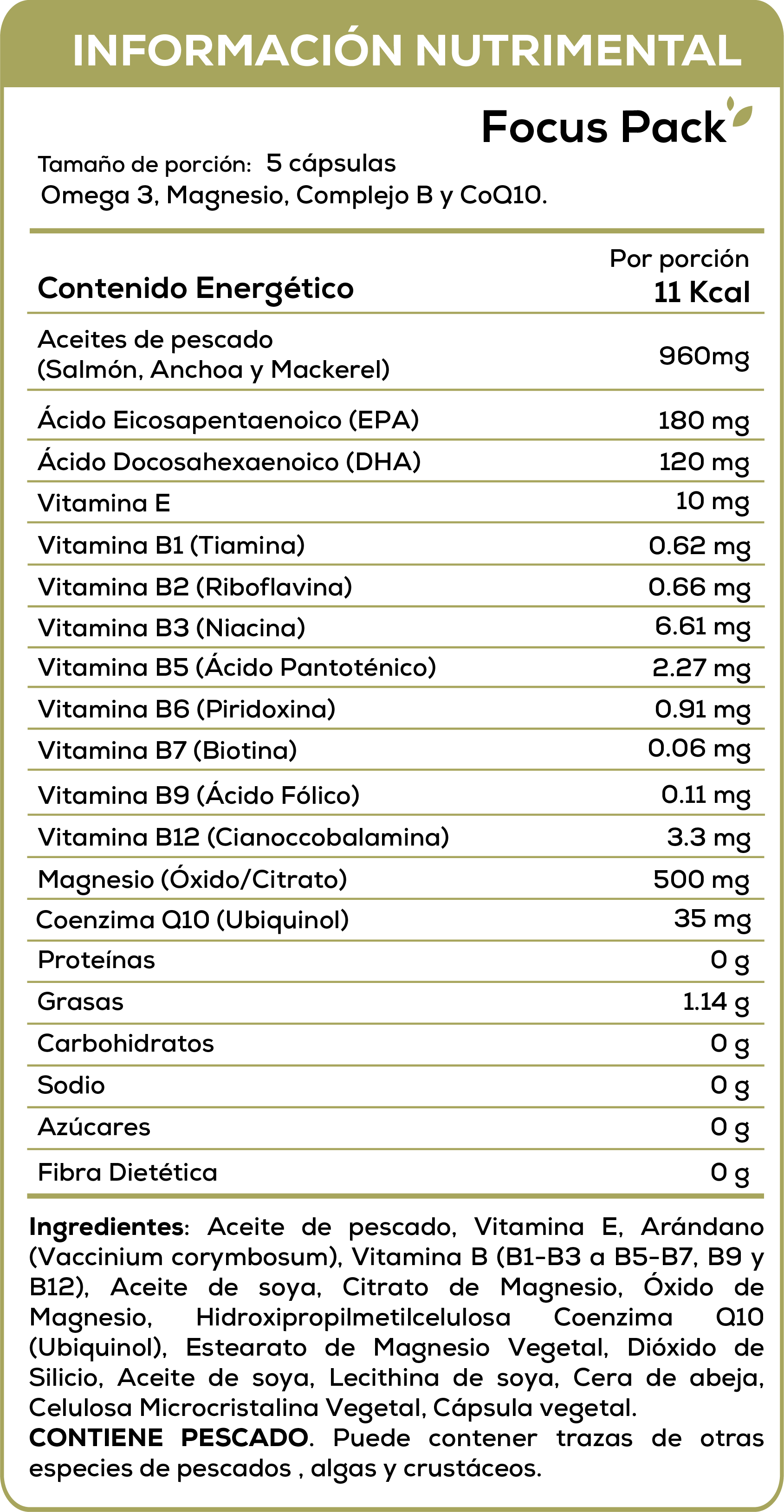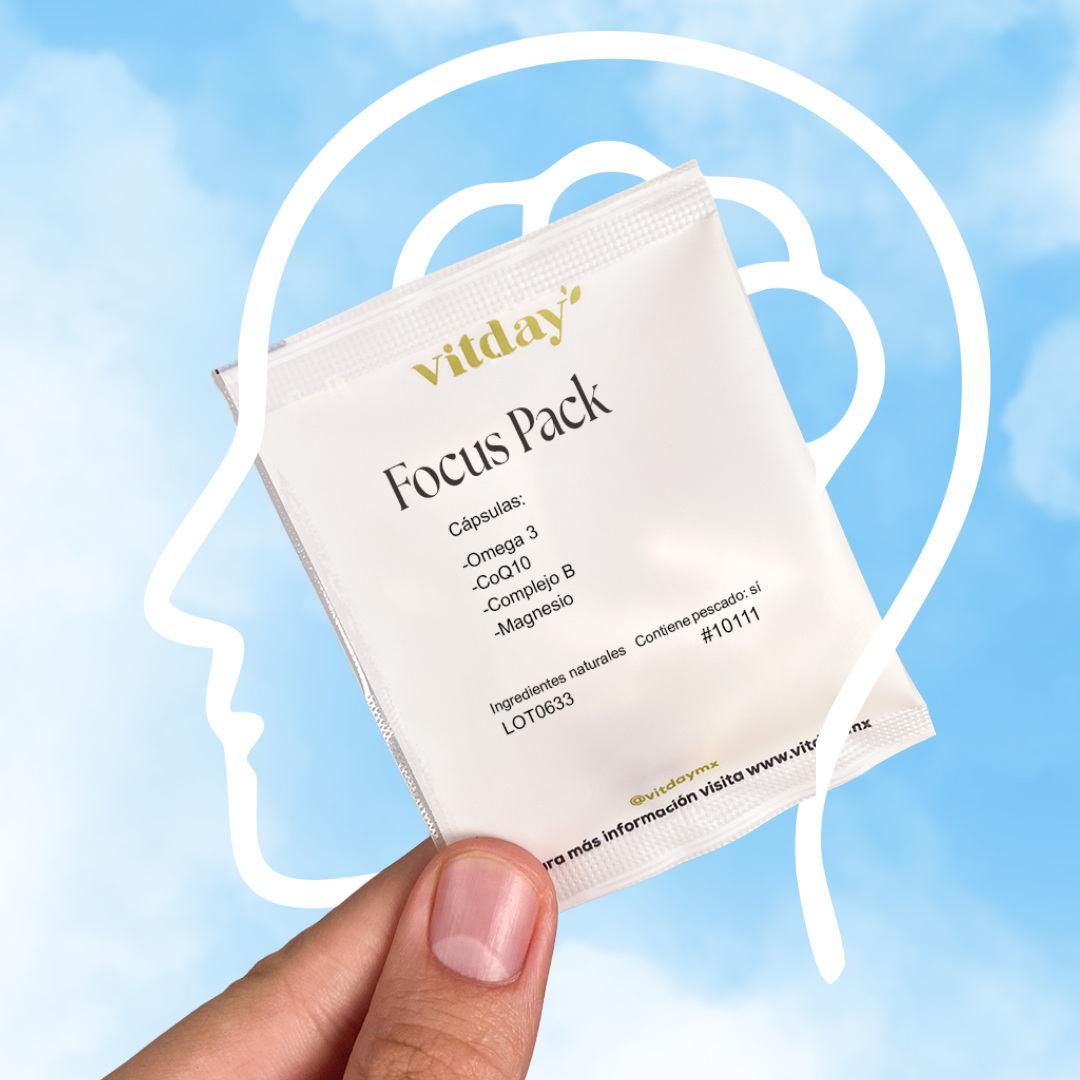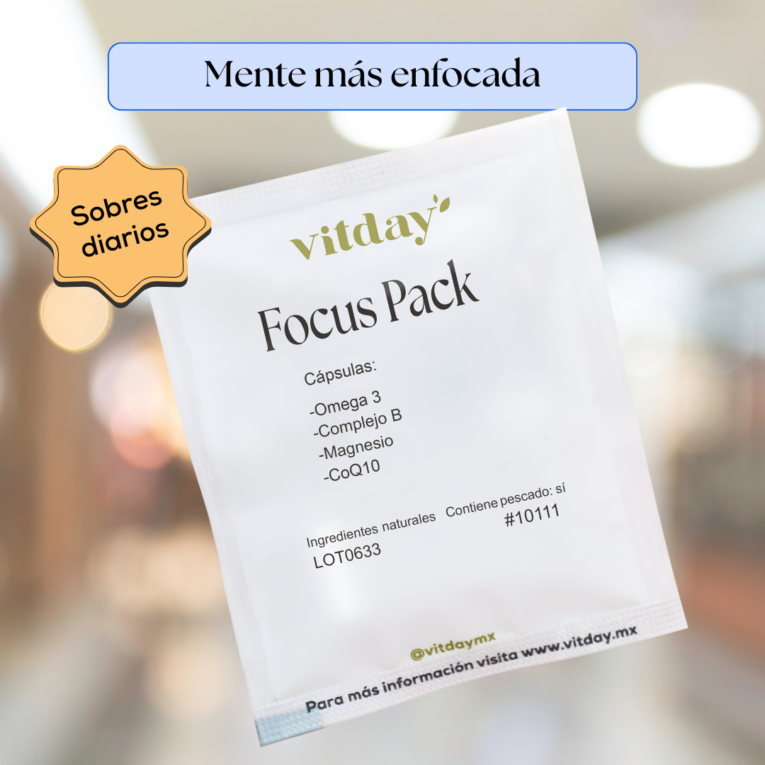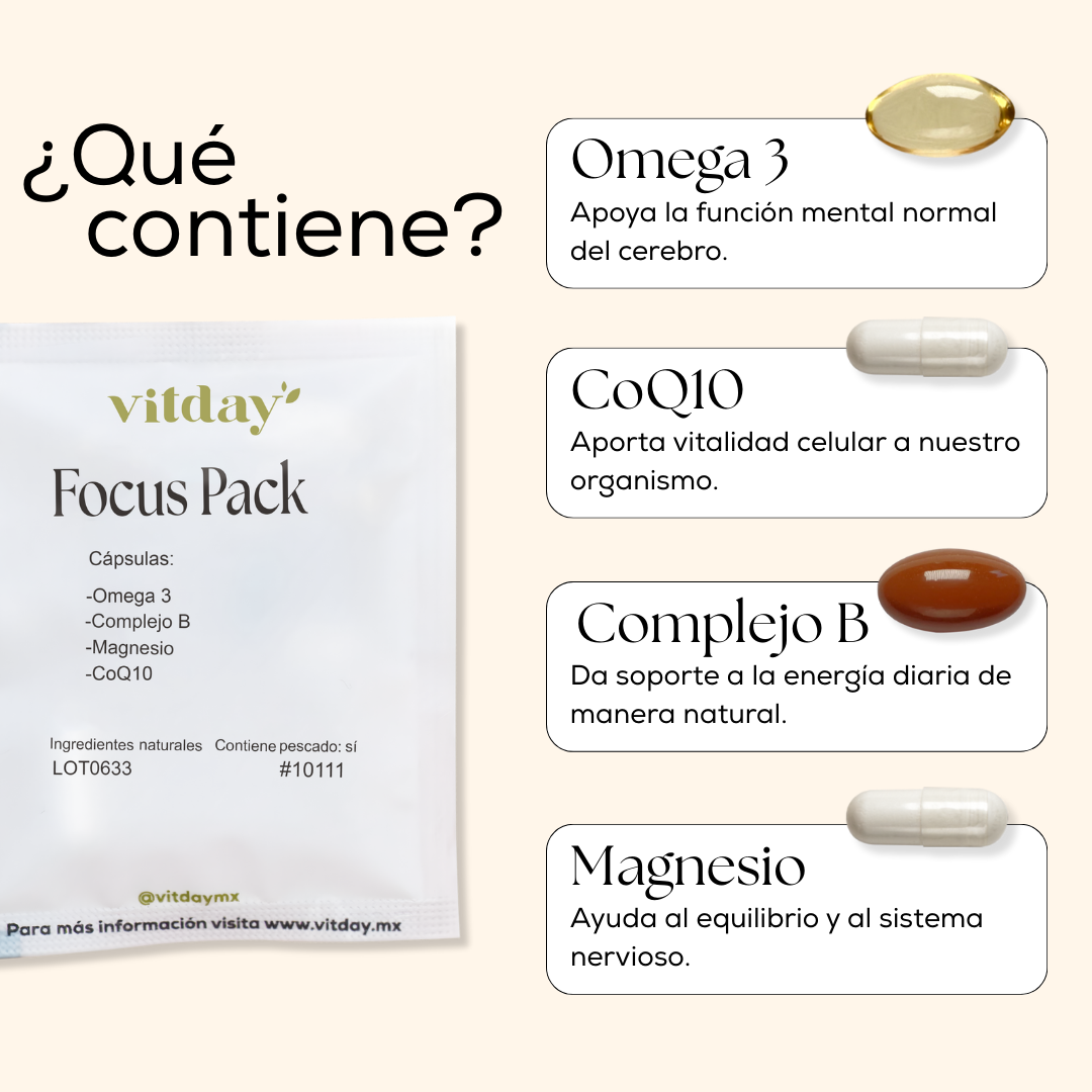 Focus Pack es un suplemento alimenticio diseñado para complementar tu bienestar mental y energético. Su combinación de Omega 3, Magnesio, Complejo B y CoQ10 está pensada para acompañar una rutina que busca claridad, vitalidad y equilibrio, siempre como apoyo a una alimentación variada y un estilo de vida saludable.