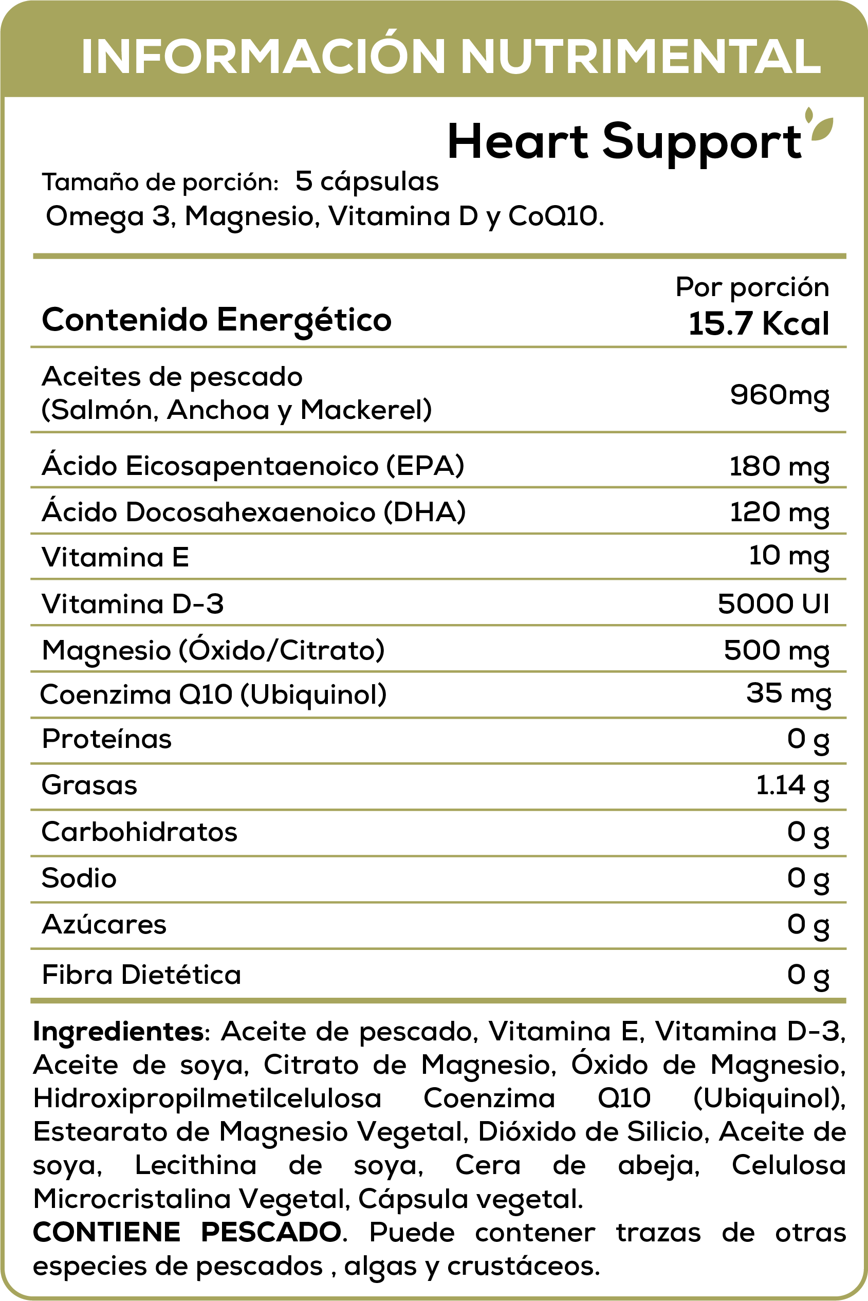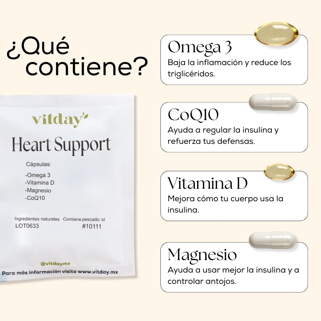 Heart Support es un suplemento alimenticio diseñado para complementar tu bienestar diario con nutrientes relacionados con el apoyo al funcionamiento general del organismo. Incluye Omega 3, CoQ10, Magnesio y Vitamina D, seleccionados para acompañar un estilo de vida saludable y una nutrición equilibrada.