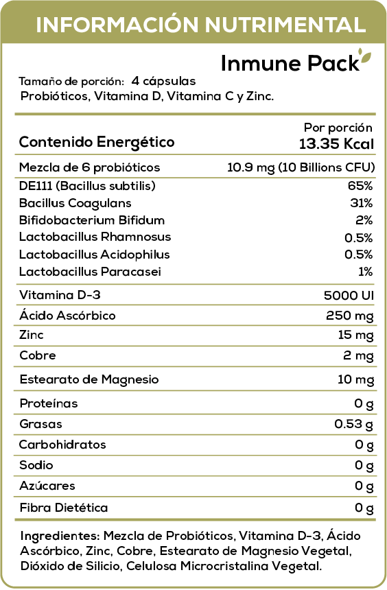 Contiene Probióticos, Vitamina C, Vitamina D y Zinc.