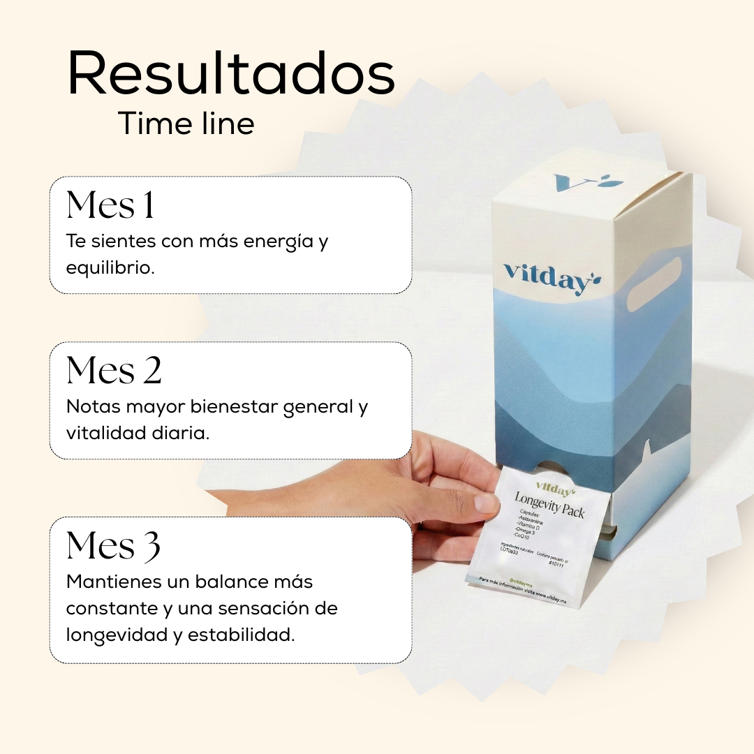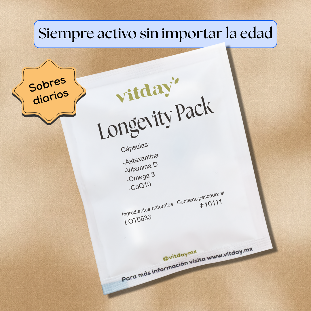 Longevity Pack es un suplemento alimenticio creado para complementar tu bienestar diario con nutrientes relacionados con vitalidad, antioxidantes y energía. Su mezcla de Omega 3, Astaxantina, Vitamina D y CoQ10 está diseñada para acompañar rutinas enfocadas en longevidad y equilibrio general, siempre como apoyo a una dieta variada.