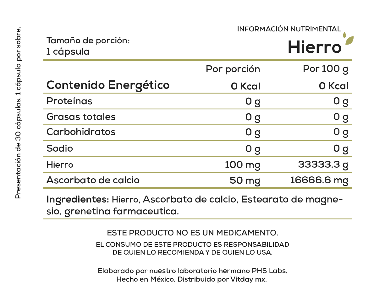 Este suplemento contiene hierro, un mineral esencial que participa en múltiples funciones fisiológicas del organismo.