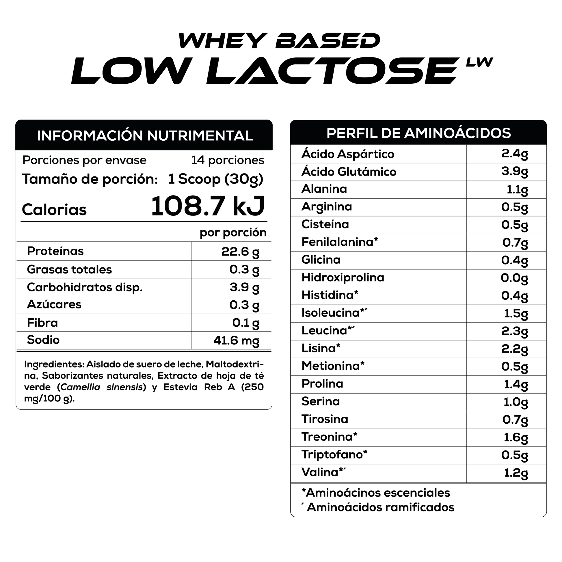 Ingredientes clave: Aislado de suero de leche, Maltodextrina, Extracto de Té Verde y Extracto natural de Vainilla.
